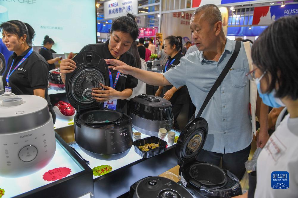 8月23日,在第十四屆中國—東北亞博覽會(huì )東北亞商品館,參展商向參觀(guān)者介紹韓國電器。