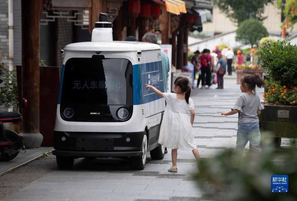 8月24日,在浙江省磐安縣尖山鎮烏石村,無(wú)人快遞車(chē)穿梭在山村街巷。