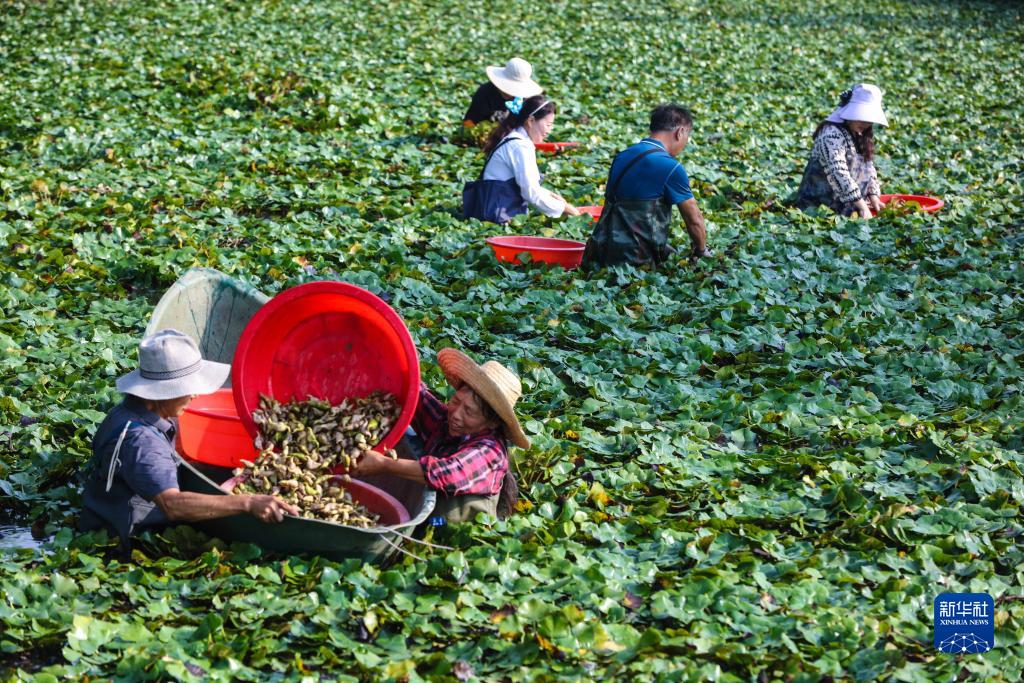 8月24日,河南省信陽(yáng)市光山縣司馬光小鎮升輝合作社農民在采摘菱角。