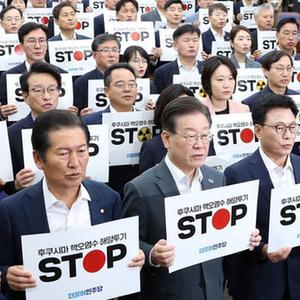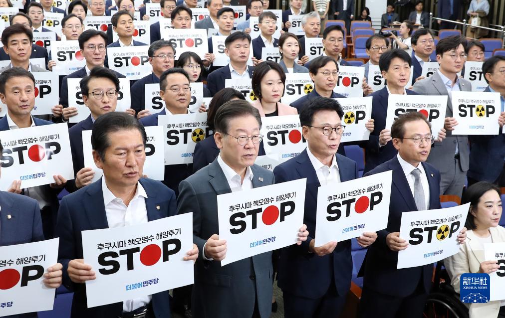 8月24日,韓國最大在野黨共同民主黨黨首李在明(前排左二)與議員在首爾國會(huì )舉行的緊急會(huì )議上手舉標語(yǔ),抗議日本核污染水排海。