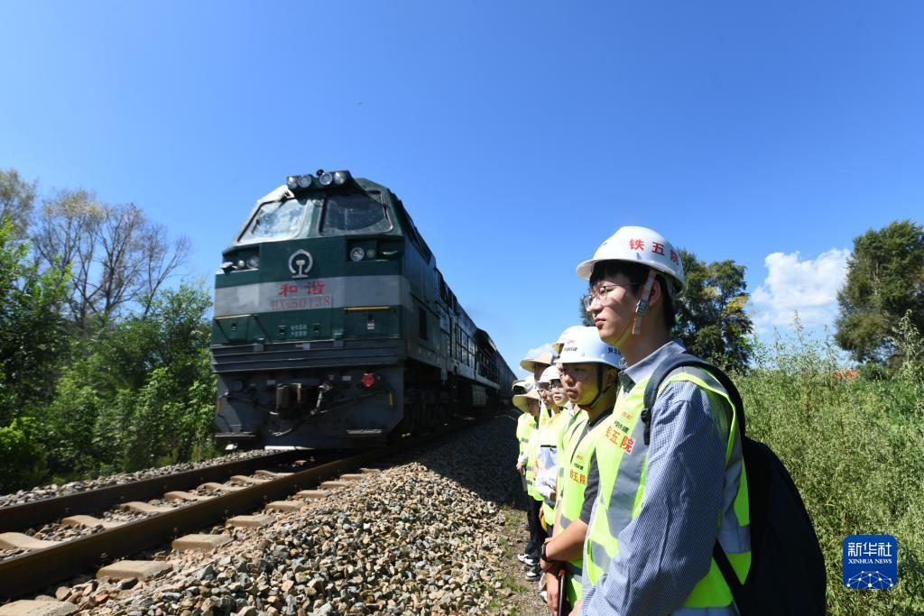 在黑龍江省雙鴨山市集賢縣的鐵路沿線(xiàn),勘察班組成員在鐵路既有線(xiàn)避讓、等待火車(chē)通過(guò)(8月24日攝)。
