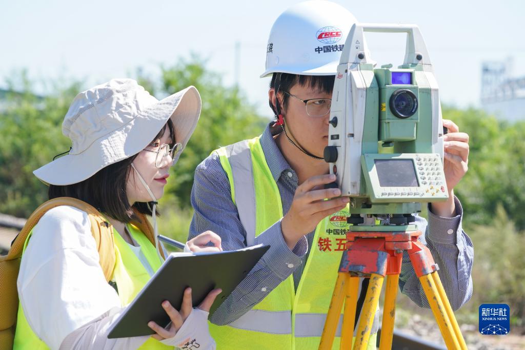 在黑龍江省雙鴨山市集賢縣的鐵路沿線(xiàn),勘察班組成員王夢(mèng)迪(左)與王樸生在鐵路既有線(xiàn)開(kāi)展測量作業(yè)(8月24日攝)。