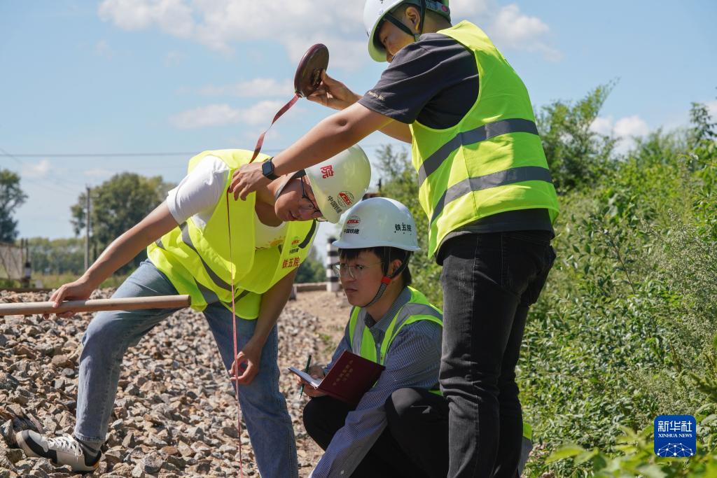 在黑龍江省雙鴨山市集賢縣的鐵路沿線(xiàn),部分勘察班組成員在鐵路既有線(xiàn)開(kāi)展測量作業(yè)(8月24日攝)。