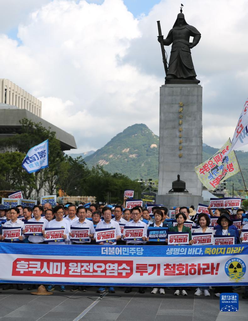 當日,韓國最大在野黨共同民主黨成員和眾多市民聚集在首爾光化門(mén)廣場(chǎng),手舉標語(yǔ)進(jìn)行示威游行,抗議日本核污染水排海。日本政府24日啟動(dòng)福島核污染水排海,這一決定遭到國際社會(huì )的批評和反對。