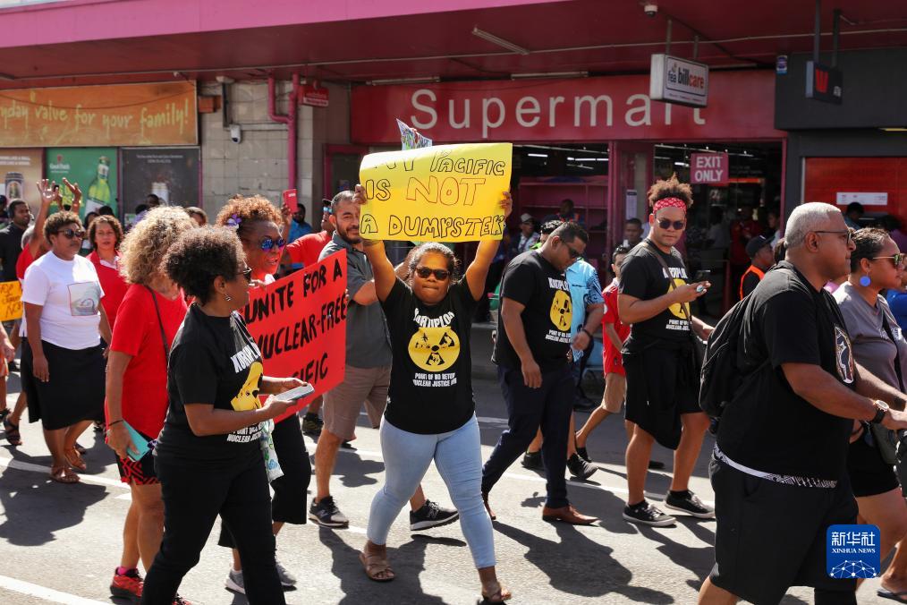當日,數百名斐濟民眾沿街游行,強烈抗議日本政府啟動(dòng)福島第一核電站核污染水排海,呼吁國際社會(huì )采取行動(dòng)保護太平洋生態(tài)和子孫后代的福祉。
