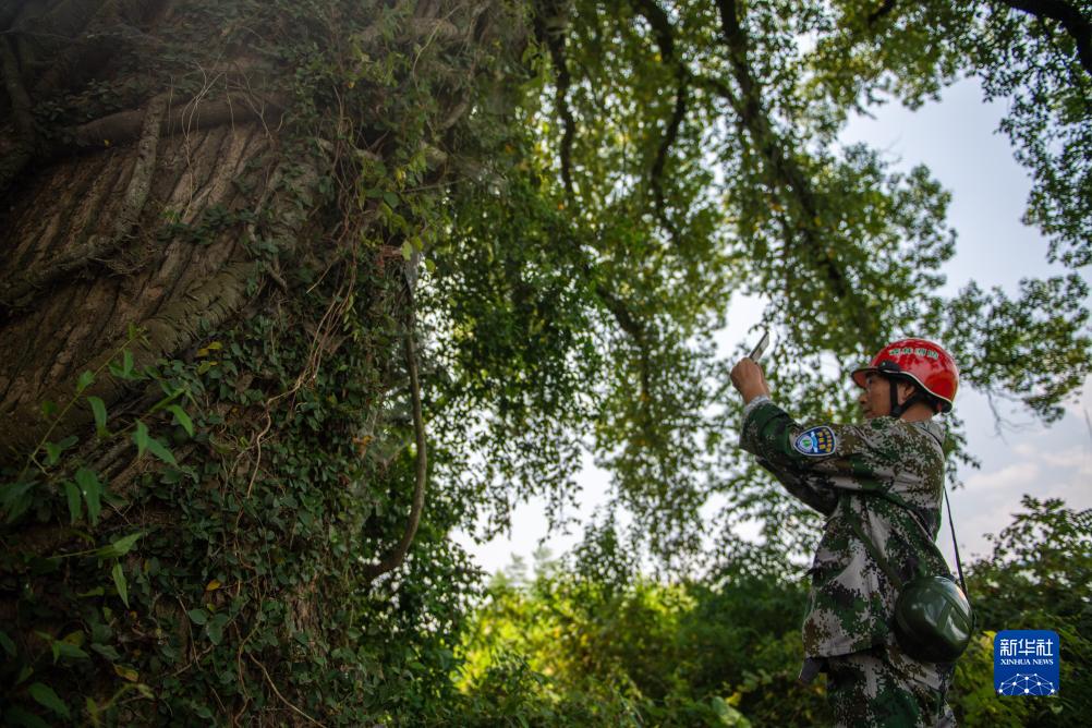 8月24日,在瀏陽(yáng)市金剛鎮丹桂村,黃蔚谷記錄古樹(shù)生長(cháng)情況。