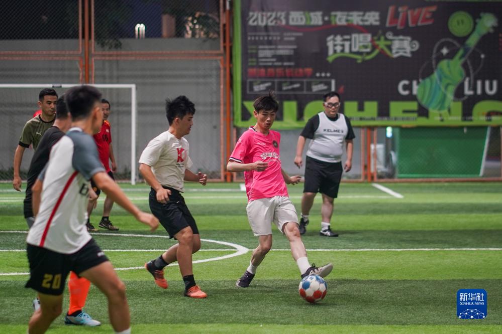 市民在南京市建鄴區西城·夜未央運動(dòng)街區踢足球(8月25日攝)。