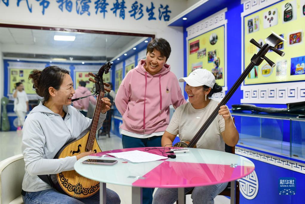 8月26日,在鄂托克前旗上海廟鎮阿勒臺嘎查文化活動(dòng)中心美育課堂上,農牧民交流樂(lè )器演奏技藝。
