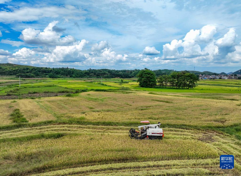 8月25日,在湖南省永州市道縣清塘鎮小坪村,農民駕駛機械收割水稻(無(wú)人機照片)。