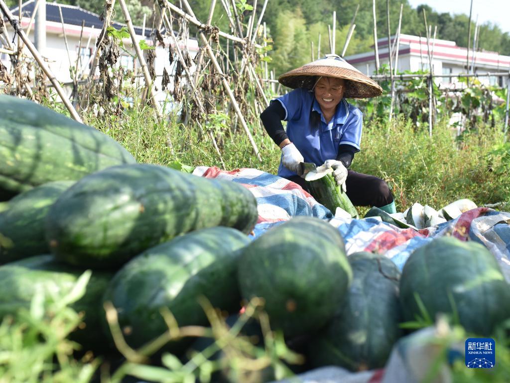 8月26日,在湖南省婁底市雙峰縣花門(mén)鎮扶槎村,農民在田間提取制種冬瓜籽。