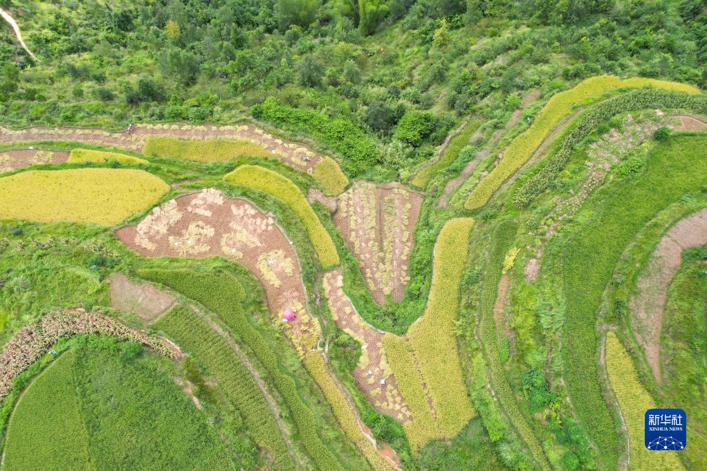 8月26日,村民在貴州省黔南布依族苗族自治州羅甸縣沫陽(yáng)鎮紅星村收割稻谷(無(wú)人機照片)。