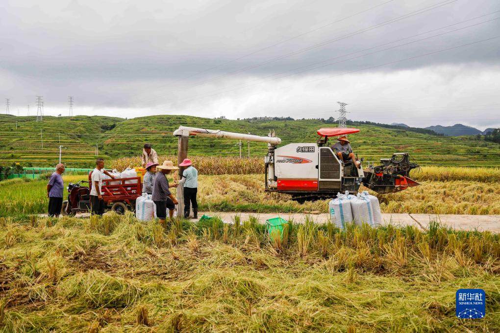 8月26日,村民在貴州省黔南布依族苗族自治州羅甸縣沫陽(yáng)鎮紅星村裝運稻谷。
