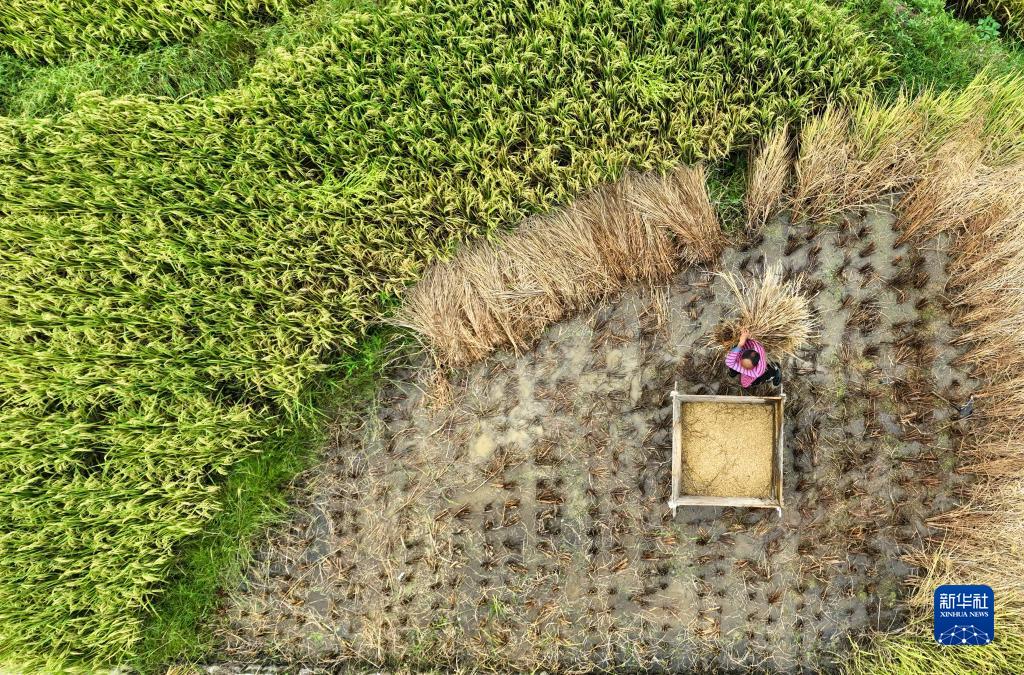 8月26日,村民在貴州省開(kāi)陽(yáng)縣禾豐鄉典寨村田間收割水稻(無(wú)人機照片)。
