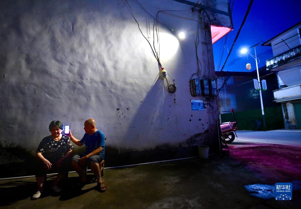 8月17日晚,鄭其輝在家門(mén)口用手機為妻子播放音樂(lè )。