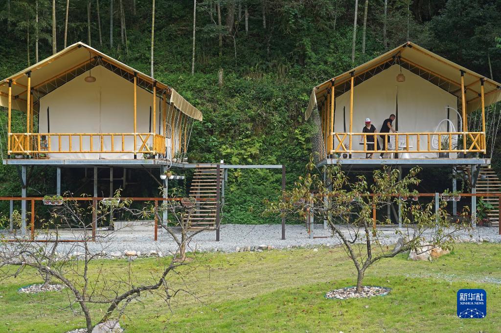 村民在打掃戶(hù)外帳篷,港背村瑪瑙巖森林小鎮的戶(hù)外帳篷營(yíng)地不久后將對外開(kāi)放(8月24日攝)。