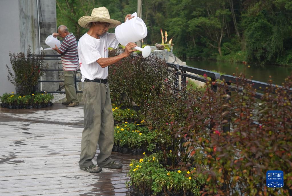 村民給景觀(guān)道邊的綠植澆水(8月24日攝)。