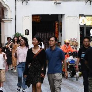 游客在??隍T樓老街參觀(guān)游玩(8月21日攝)。