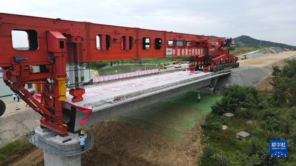 這是中國鐵建大橋局新建滬寧合高鐵全線(xiàn)首榀箱梁架設現場(chǎng)(8月27日攝,無(wú)人機照片)。