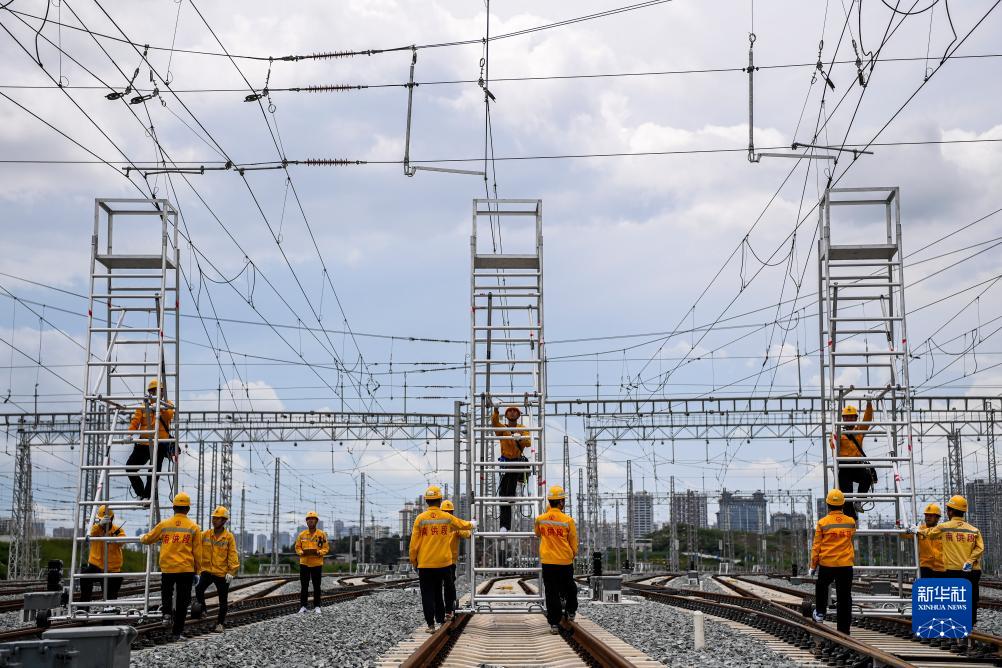 8月27日,中國鐵路南寧局集團有限公司南寧供電段的接觸網(wǎng)工在南寧第二動(dòng)車(chē)所存車(chē)線(xiàn)內進(jìn)行電路檢修作業(yè)。