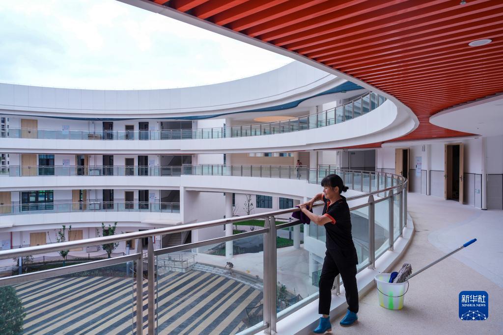 8月27日,在重慶市北碚區兩江春暉小學(xué),工作人員在清潔教學(xué)樓護欄。