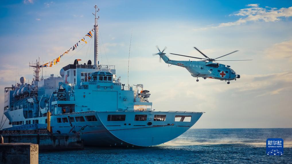 8月24日,中國海軍“和平方舟”號醫院船靠泊所羅門(mén)群島霍尼亞拉港期間,艦載醫療救護直升機赴外島開(kāi)展巡診服務(wù)。
