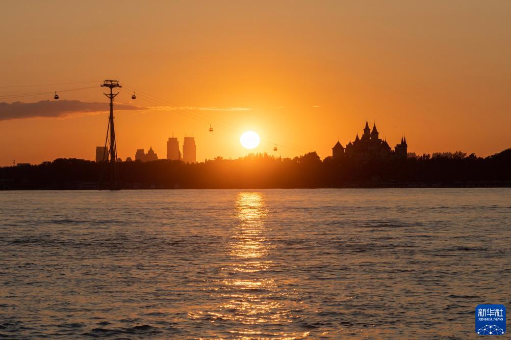 松花江哈爾濱段落日景觀(guān)(8月27日攝)。