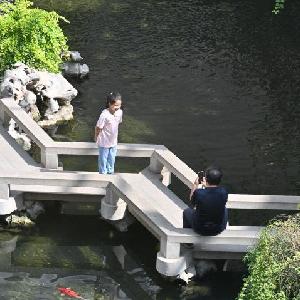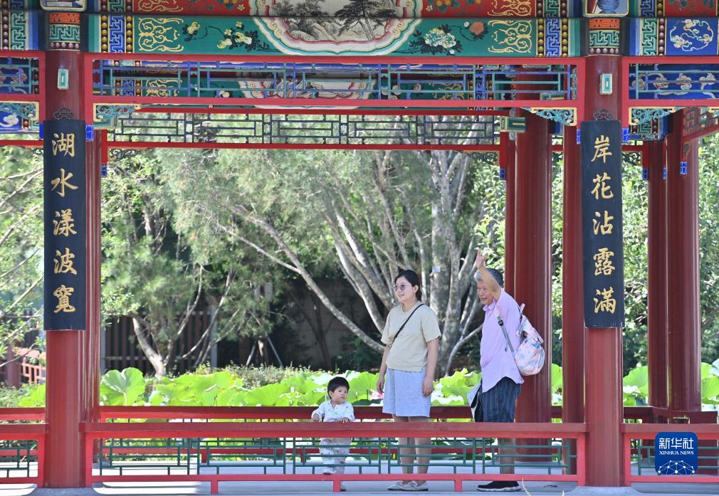 8月28日,參觀(guān)者在中國園林博物館鏡影亭參觀(guān)。
