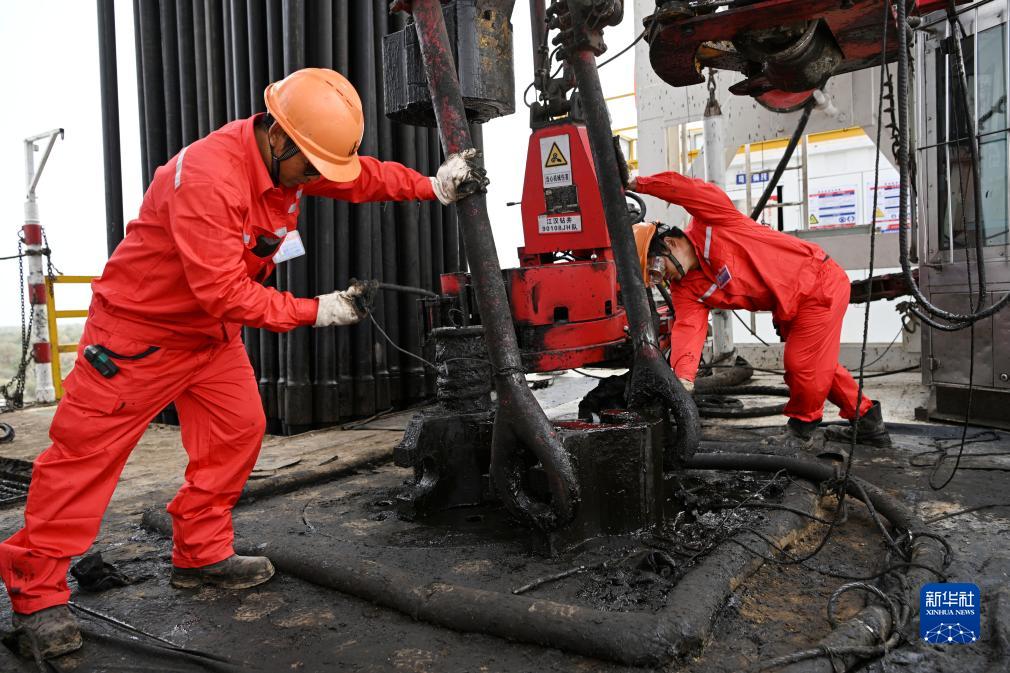 工作人員在中國石化塔里木盆地“深地工程”躍進(jìn)3-3XC油氣井進(jìn)行鉆井輔助作業(yè)(8月21日攝)。