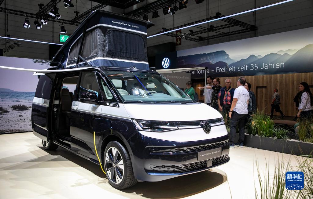 這是8月28日在德國杜塞爾多夫國際房車(chē)展上拍攝的大眾汽車(chē)全球首發(fā)“加州概念”插電式混合動(dòng)力露營(yíng)車(chē)。