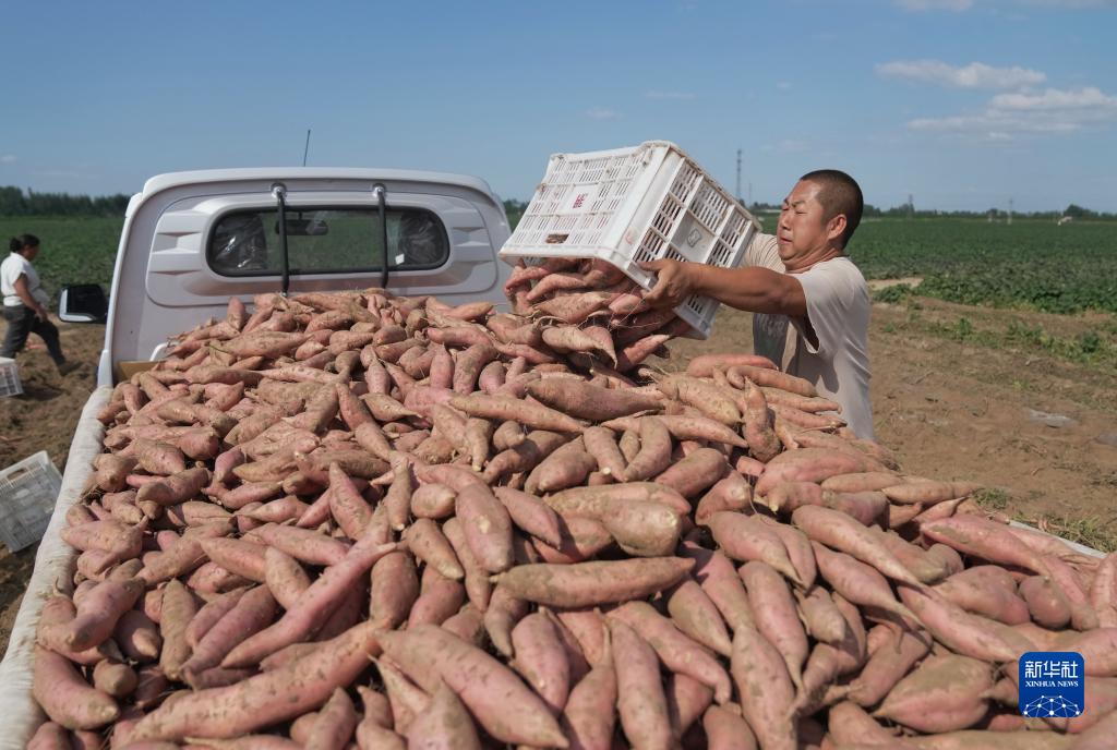 8月28日,灤州市九百戶(hù)鎮一家鮮食紅薯種植合作社的社員在將收獲的煙薯裝車(chē)。