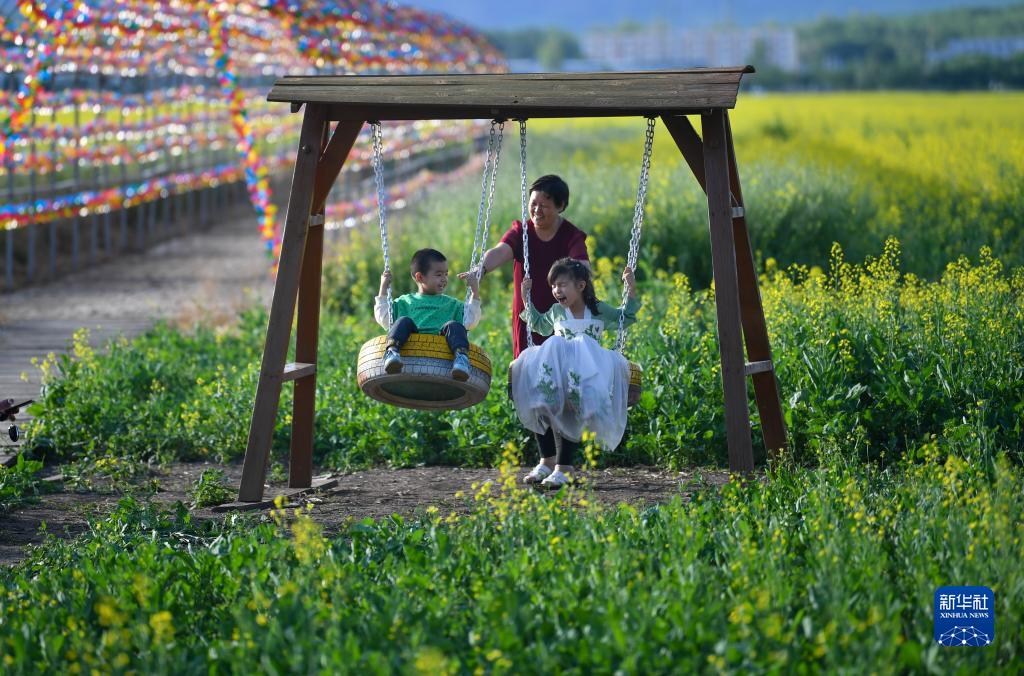 小朋友在新疆伊犁哈薩克自治州昭蘇縣油菜花田里蕩秋千(7月17日攝)。