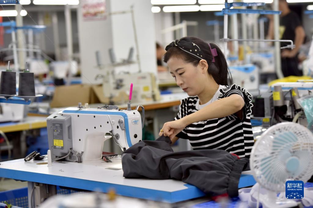 8月29日,工人在河北省威縣姜七里村一家服飾廠(chǎng)加工服裝。