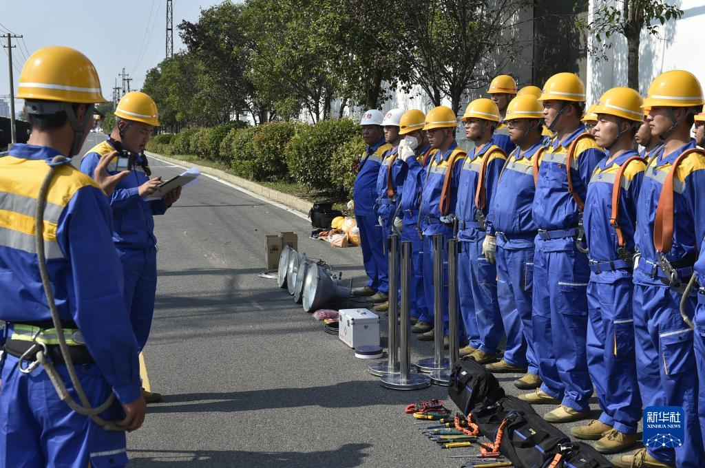 8月29日,在鄭州北站編組場(chǎng),中國鐵路鄭州局集團有限公司鄭州供電段工作人員在檢修投光燈前進(jìn)行準備工作。