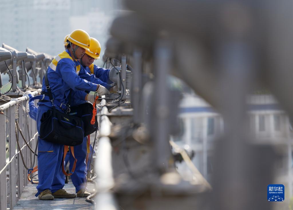 8月29日,中國鐵路鄭州局集團有限公司鄭州供電段工作人員在鄭州北站編組場(chǎng)的燈橋上檢修投光燈。