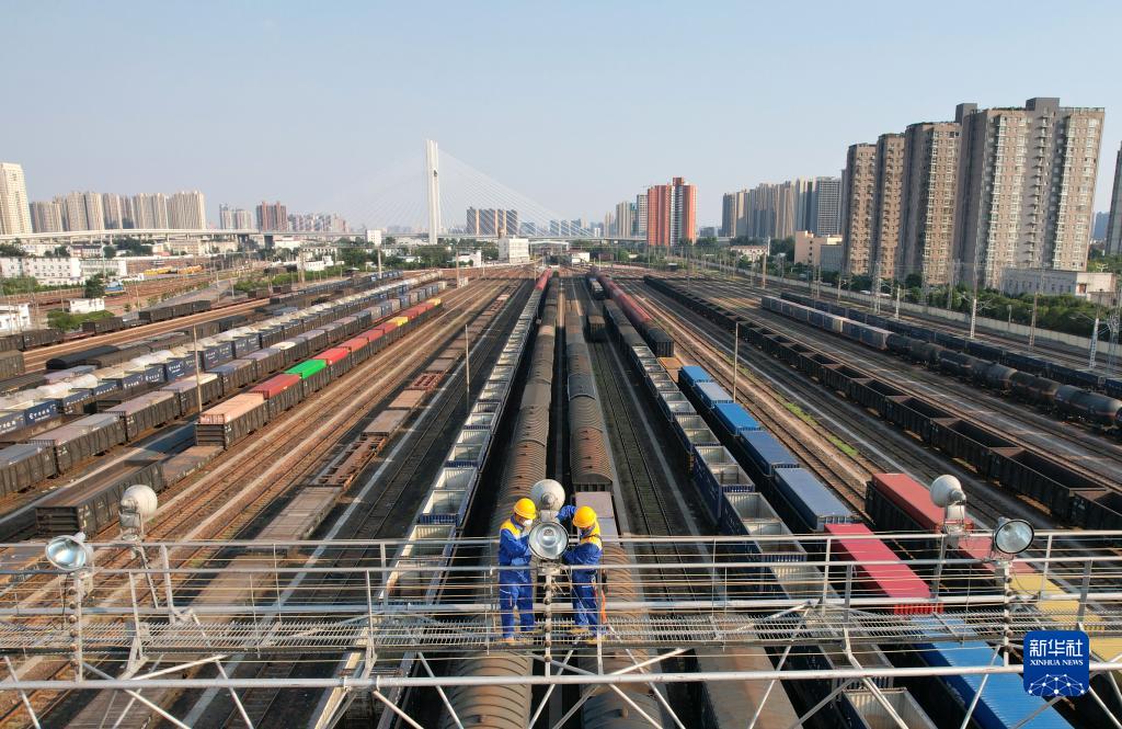 8月29日,中國鐵路鄭州局集團有限公司鄭州供電段工作人員在鄭州北站編組場(chǎng)的燈橋上檢修投光燈(無(wú)人機照片)。