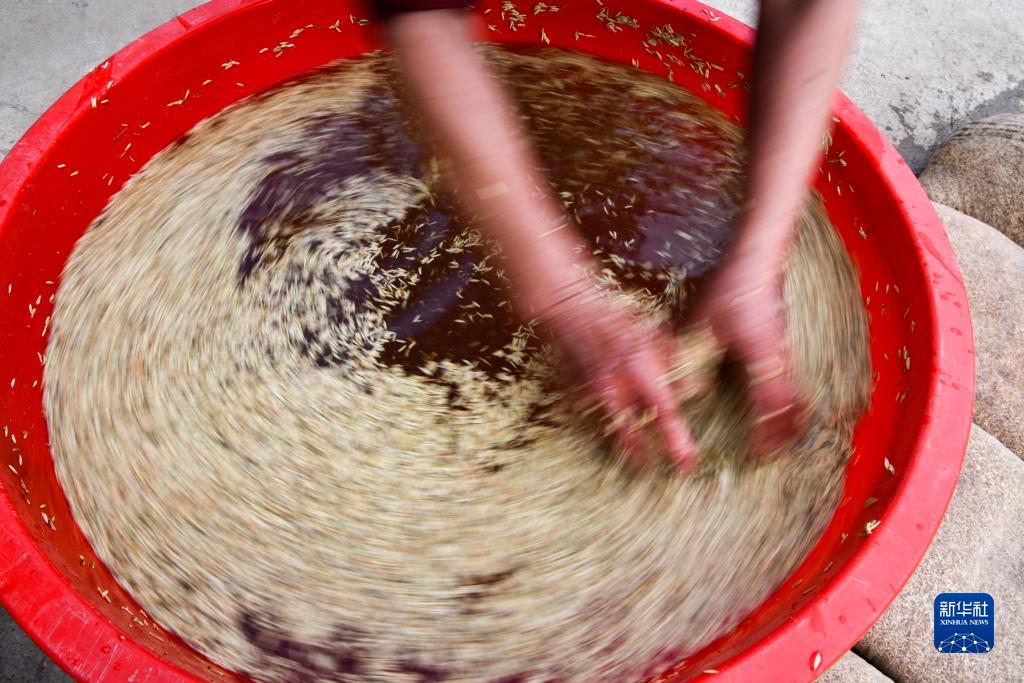 陳良東在浸泡稻種,為雜交水稻育苗做準備(4月6日攝)。