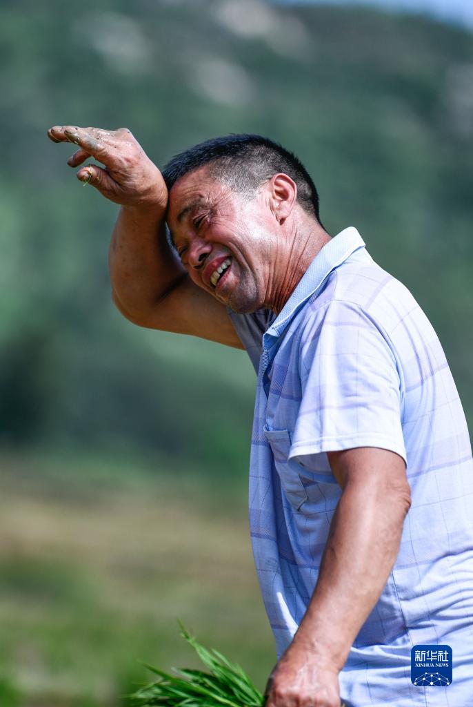 陳良東在水稻制種基地里插秧時(shí)擦汗水(5月29日攝)。
