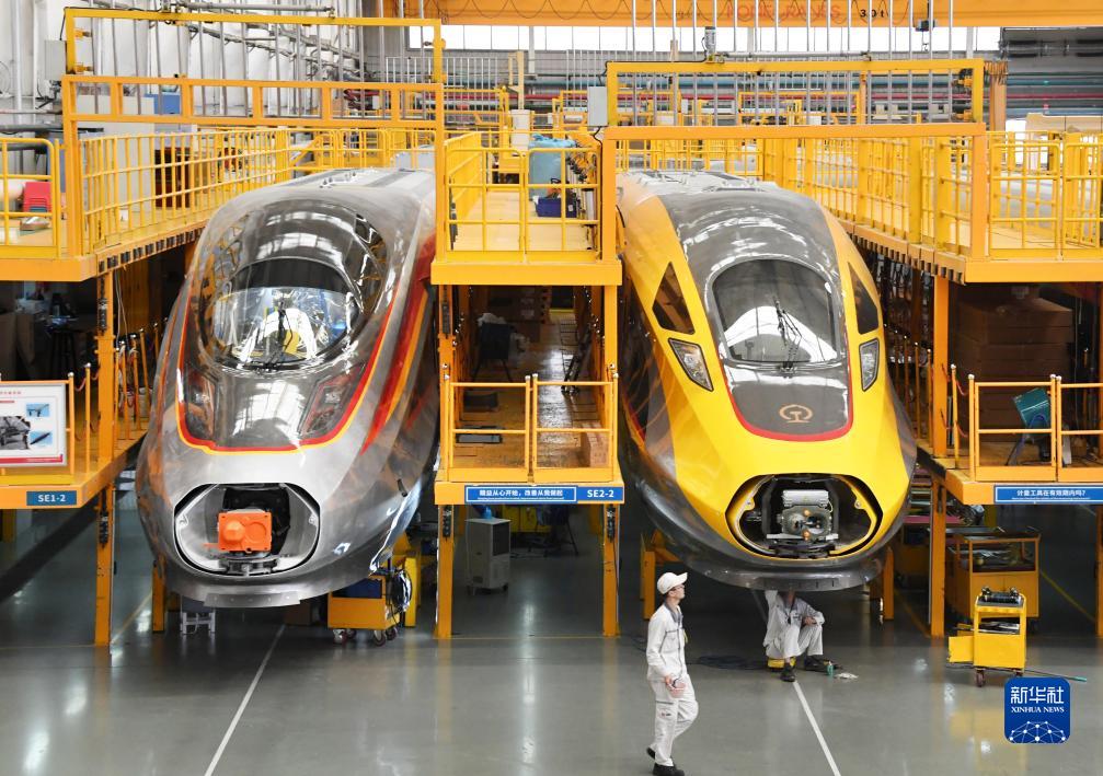 8月29日,中車(chē)青島四方總裝車(chē)間工作人員在復興號智能動(dòng)車(chē)組生產(chǎn)線(xiàn)上進(jìn)行裝配作業(yè)。