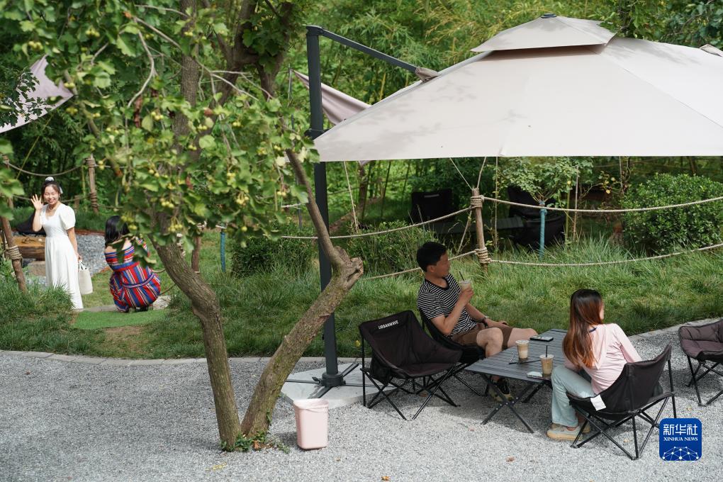 游客在秦嶺北麓的西安市周至縣馬召鎮辛口村一家咖啡館的營(yíng)地內休閑(7月14日攝)。