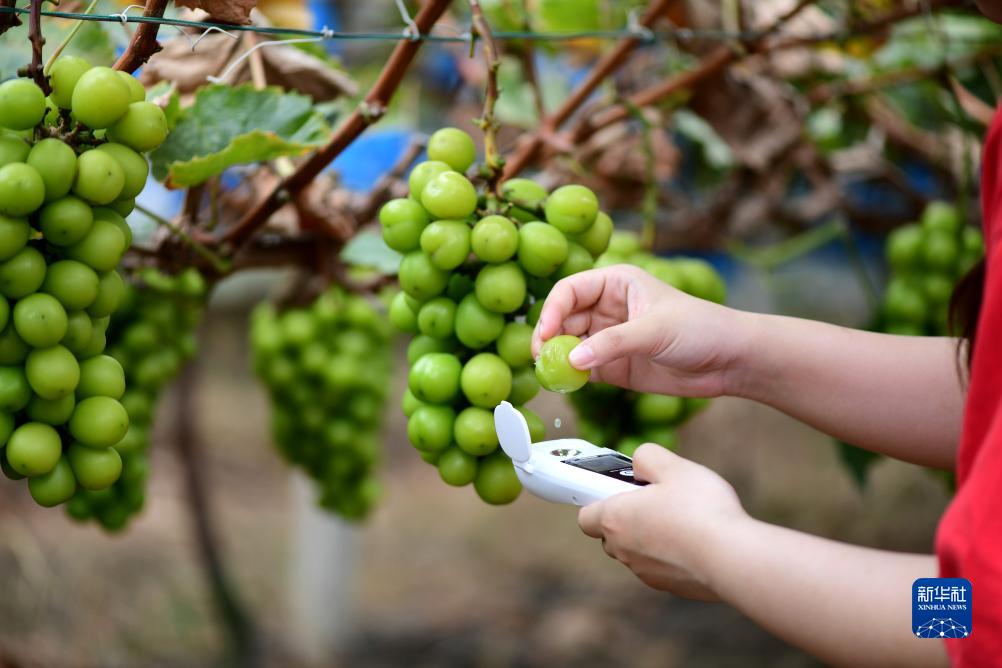 8月30日,潘雅潔在肥西縣紫蓬鎮的葡萄園里用儀器檢測葡萄的含糖數據。