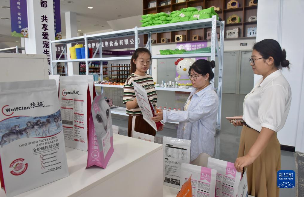 8月30日,顧客在河北省邢臺市南和區賈宋鎮一家寵物用品生產(chǎn)企業(yè)電商展廳了解產(chǎn)品信息。