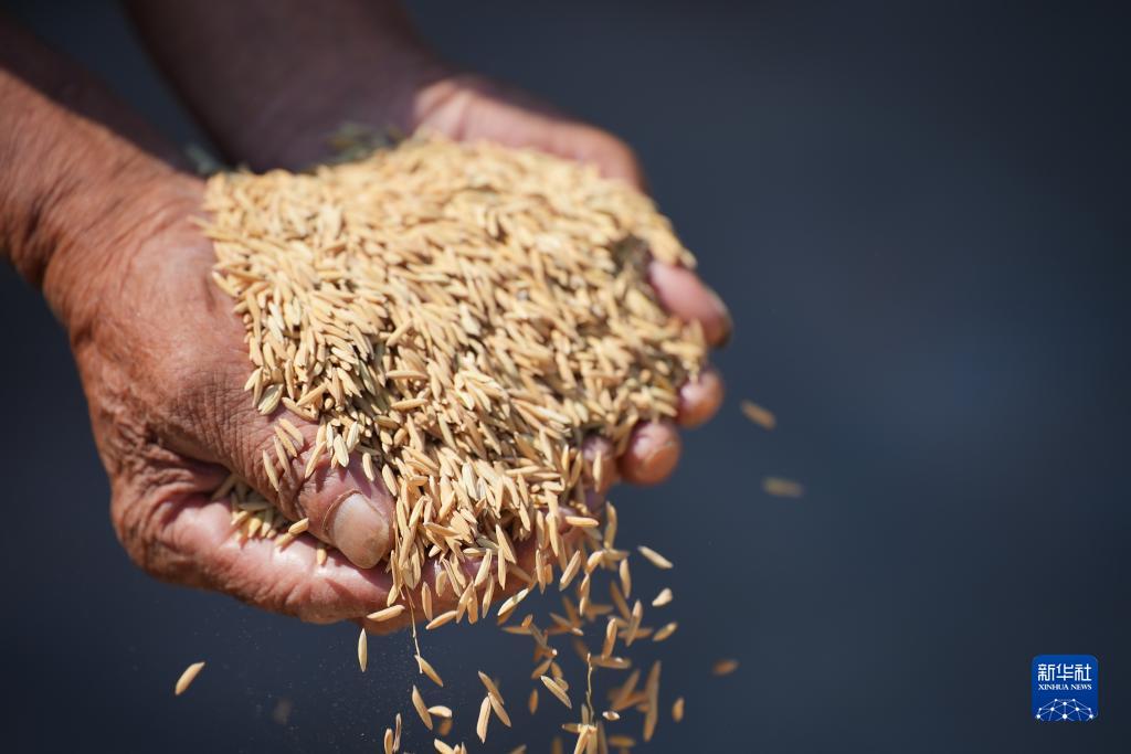 8月30日,貴州省黔東南苗族侗族自治州岑鞏縣思旸鎮新安村村民在查看收獲的稻谷。