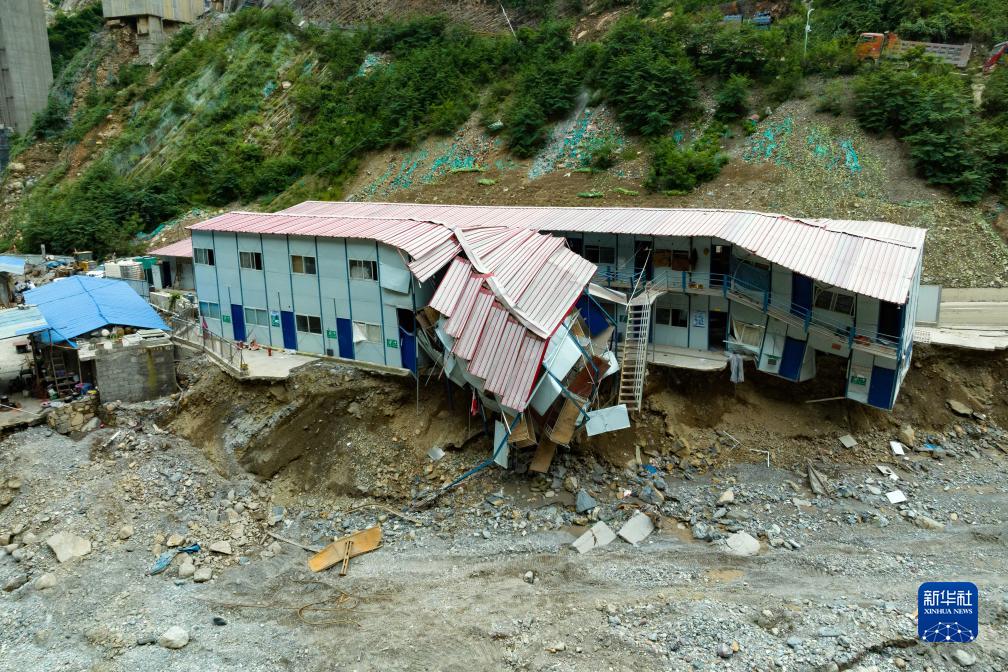 這是8月30日在位于金陽(yáng)縣境內蘆稿林河下游的蜀道集團沿江高速JN1(金寧一)標段項目部鋼筋加工場(chǎng)拍攝的被山洪沖毀的民工駐地板房(無(wú)人機照片)。