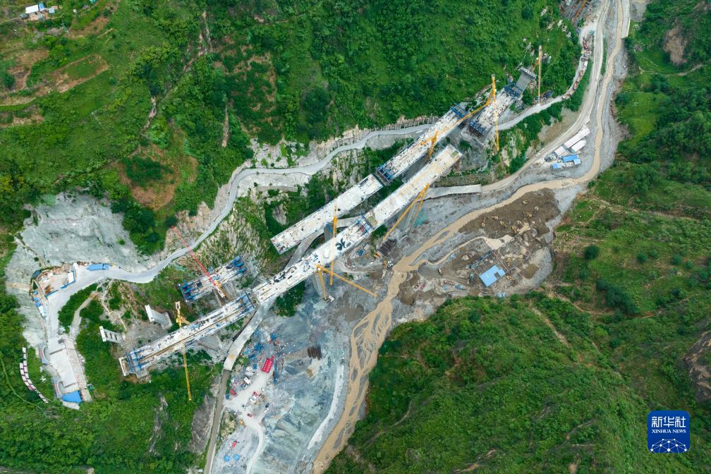 8月30日拍攝的位于金陽(yáng)縣境內蘆稿林河下游的蜀道集團沿江高速JN1(金寧一)標段項目部鋼筋加工場(chǎng)民工駐地板房(右上)已被山洪沖毀(無(wú)人機照片)。