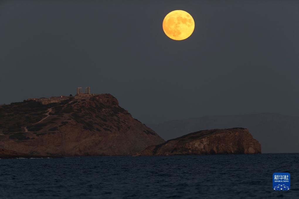 8月30日,“超級月亮”從希臘蘇尼翁角的波塞冬廟上空升起。