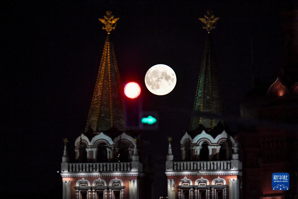 這是8月30日在俄羅斯首都莫斯科紅場(chǎng)附近拍攝的“超級月亮”。