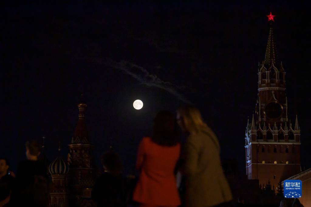 這是8月30日在俄羅斯首都莫斯科紅場(chǎng)附近拍攝的“超級月亮”。
