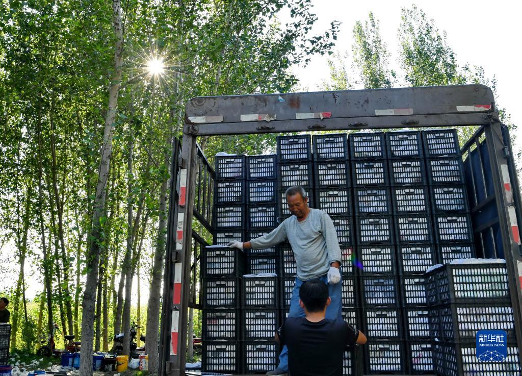 8月29日,河北唐山遷安市新房子村農民將鮮梨裝車(chē)外運。