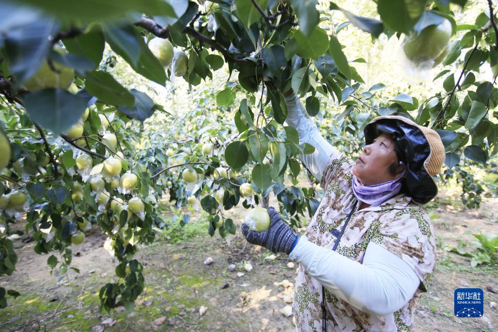 8月29日,河北唐山遷安市新房子村農民在采收鮮梨。