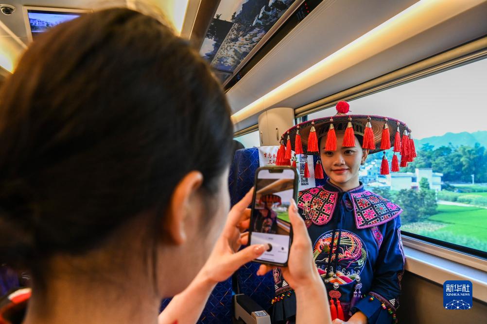 8月31日,身穿民族服裝的乘客在由南寧東開(kāi)往貴陽(yáng)北的G4308次列車(chē)上拍照留念。